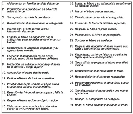 Más adelante, está la propuesta de Vladimir Propp “Las funciones de Vladimir Propp”. Donde él analiza los cuentos populares y relaciona los puntos recurrentes que encuentra en ellos y es así que crean la estructura constante de las narraciones de los cuentos de hadas y el camino del héroe. Propp señala 31 puntos que a pesar de que no todas las narraciones los involucran sirven como base para la composición de una historia (Propp 12).