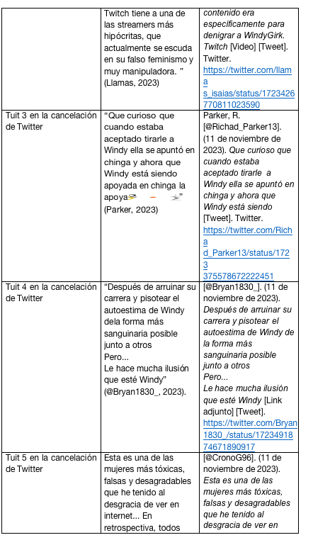 La tabla 4, ejemplifica estas incoherencias. Anteriormente, la streamer mexicana Arigameplays había hecho declaraciones y acciones ofensivas en contra Windygirk, otra streamer. El hecho de que tras años de “disputa” entre estas dos streamers y sumado a funas previas, Arigameplays declarara que “la hace feliz” que Windygirk esté invitada a un evento organizado por ElRubius, causó una inconformidad grande en Twitter, llevando a la cancelación de Arigameplays (véase imágenes 2 y 3).