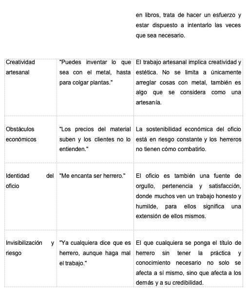 La práctica de la herrería en la Ciudad de México, como se observa en la entrevista, responde a una lógica de aprendizaje situado. El saber no se enseña desde libros, sino mediante la experiencia cotidiana en el taller, en la repetición de movimientos, en la observación, la práctica constante y en las ganas de seguir aprendiendo. Así, la adquisición del conocimiento técnico y simbólico ocurre en el mismo espacio donde se reproduce la cultura del oficio.