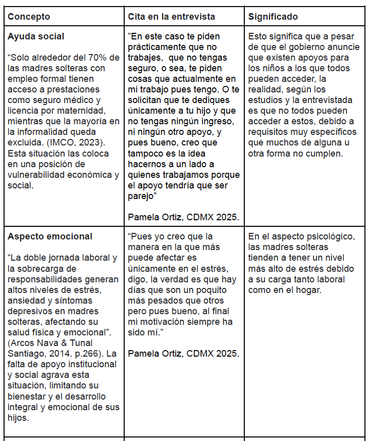 También en la entrevista se muestra el resultado de la investigación respecto a la ayuda social y aquí Pamela, confirma el hecho de que no todas las mamás solteras reciben ayuda del gobierno, es más, ella misma menciona que ha intentado pedir cierta ayuda social, y menciona que “te cierran las puertas” y por lo que comenta, estas instituciones piden a las madres que no trabajen, no tengan seguro o ingresos y que básicamente se dediquen solamente a sus hijos, demostrando que por más que el gobierno afirme que ayuda a las mujeres, la realidad es que no y solo esta ayuda está dirigida a cierto sector muy específico de las madres solteras, cuando el apoyo debería ser para todas.