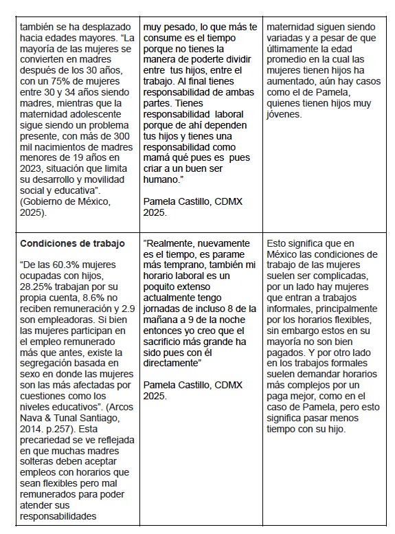 Considero que es necesario el abordar esta problemática desde una perspectiva crítica que busca analizar las condiciones que caracterizan la situación laboral de las madres solteras en México, considerando indicadores como el ingreso, la formalidad del empleo y la disponibilidad de servicios de cuidado infantil y también considero que es muy importante que se brinde más representación de este grupo de mujeres para que su lucha del día a día sea visibilizada por la sociedad.