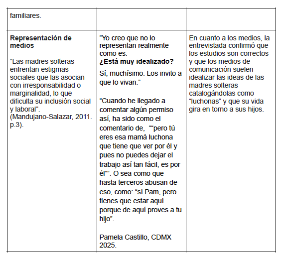 Representación social y mediática de las madres solteras “Las madres solteras enfrentan estigmas sociales que las asocian con irresponsabilidad o marginalidad, lo que dificulta su inclusión social y laboral”. (Mandujano-Salazar, 2011. p.3). Esta representación negativa limita la visibilización positiva de sus experiencias y sus retos del día a día, reforzando prejuicios que afectan su autoestima y sobre todo sus oportunidades.